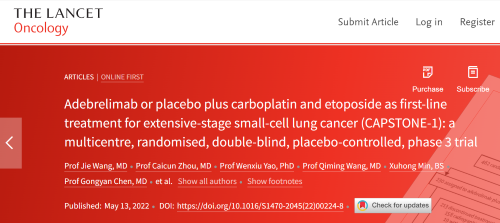 北京时间2022年5月14日,AG官网医药自主研发的PD-L1抑制剂阿得贝利单抗治疗广泛期小细胞肺癌的III期临床研究(CAPSTONE-1研究)成果正式全文在线发表于国际权威学术期刊《柳叶刀·肿瘤学》(《THE LANCET Oncology》,影响因子41.316)。CAPSTONE-1研究结果显示,阿得贝利单抗联合化疗一线治疗广泛期小细胞肺癌相较于安慰剂联合化疗可以显著延长患者总生存期至15.3个月[1],刷新现有免疫药物一线治疗广泛期小细胞肺癌的总生存纪录[2]。